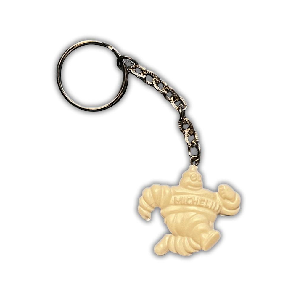 A small but iconic piece of automotive history, this vintage Michelin Man keychain features Bibendum in classic form — molded in an ivory-toned material and suspended from a sturdy metal chain and key ring. With MICHELIN embossed across his chest, the figure captures the playful optimism and design clarity that made the Michelin Man one of the most enduring brand mascots of the 20th century.