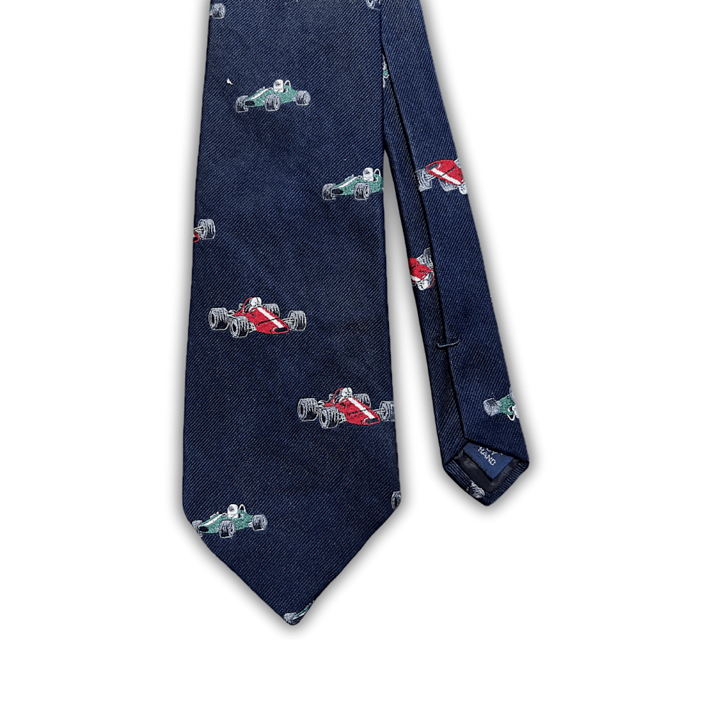 This vintage Polo Ralph Lauren for Neiman Marcus necktie features an all-over pattern of 1960s Formula-style race cars—rendered in crisp red and British-racing-green—set against a deep navy ground. Woven in pure silk with a subtle twill texture, it captures that golden-era motorsport energy: open-cockpit cars, hand-stitched leather gloves, and the romantic speed of Grand Prix racing.